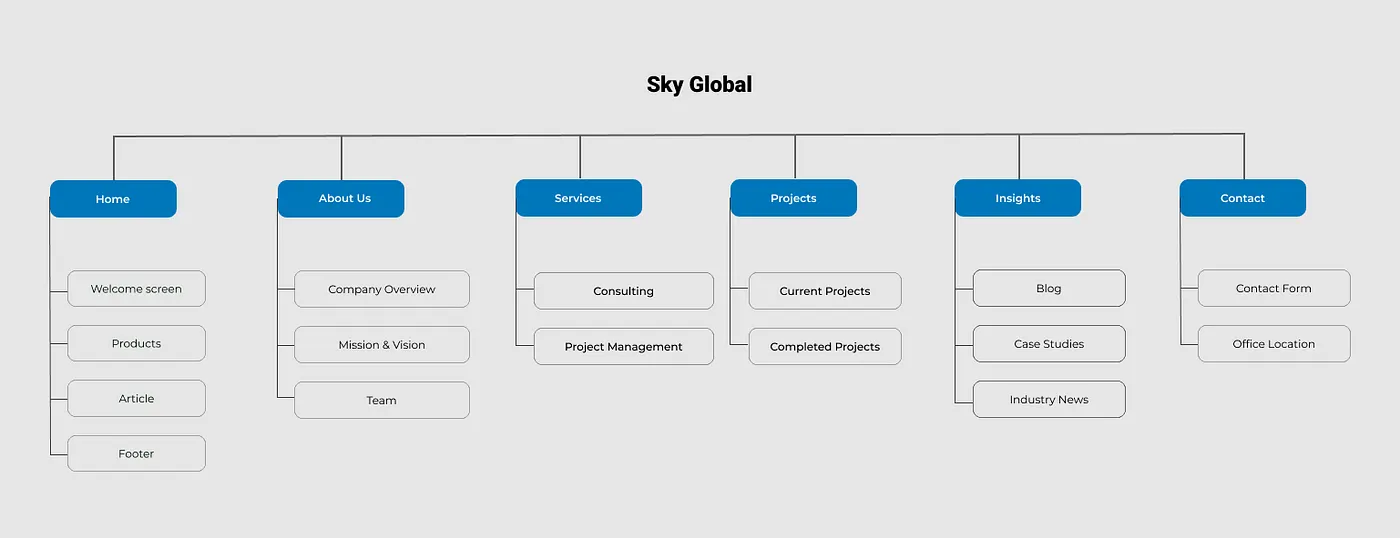 In the ideation phase for SkyGlobal, I created a sitemap and user flow to simplify navigation. The sitemap will outline key sections, and the user flow will map out tasks like booking services. This helped me to improve my design for a better user experience.